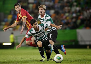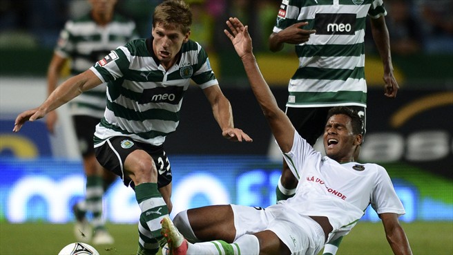 | Idalécio e Silva em disputa de bola no jogo de Alvalade |