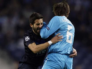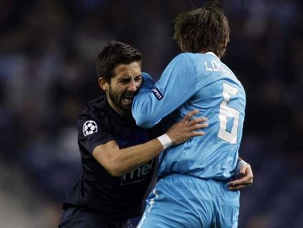 | Madeirense Rúben Micael em luta com o central belga Lombaerts |